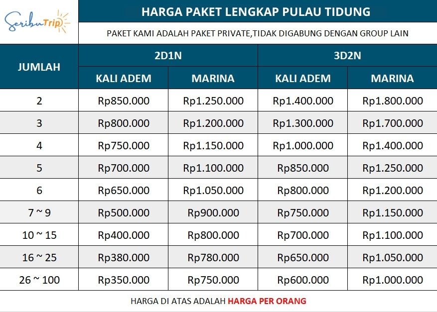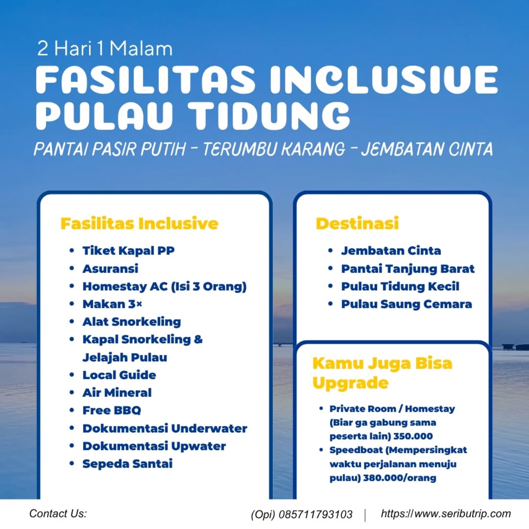Sebagai agen wisata Pulau Tidung terpercaya, kami menyediakan berbagai paket liburan lengkap dan terjangkau untuk keluarga, pasangan, maupun rombongan. Mulai dari tiket transportasi, penginapan, makan khas laut segar, hingga aktivitas seru semuanya sudah termasuk dalam paket kami.